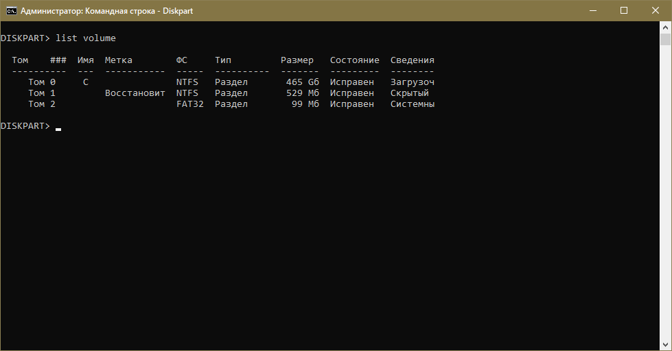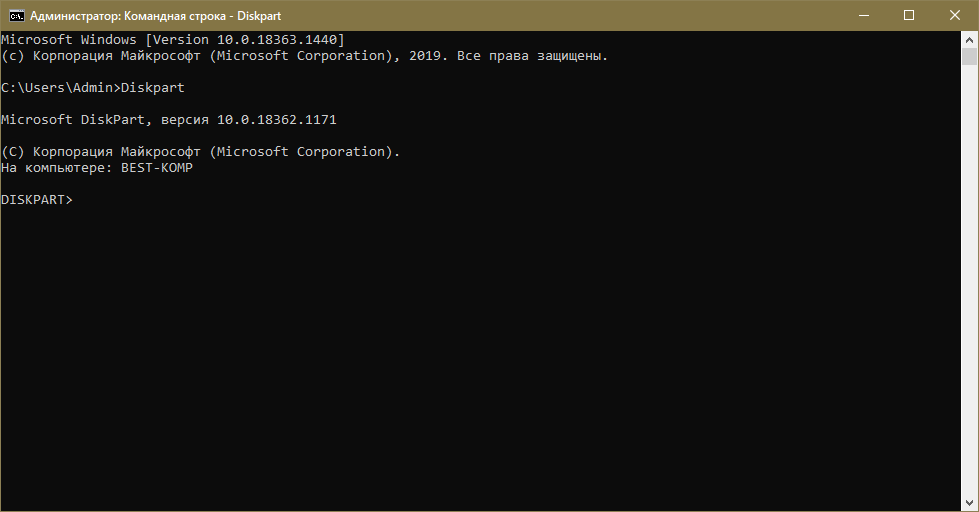 - Нужно ввести в строку команду «Diskpart». Это позволит запустить консольную утилиту.