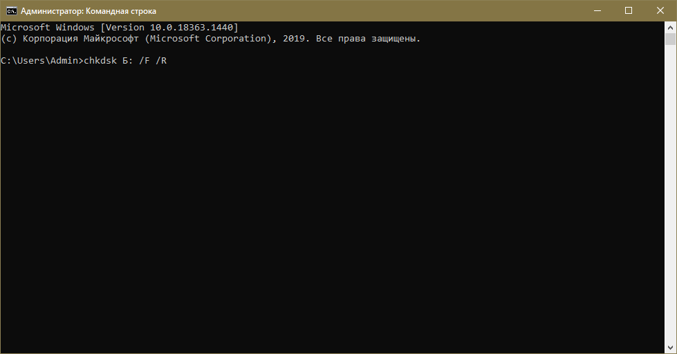 Запуск желательно проводить от имени администратора. В открытый интерфейс «Командной строки» вводится chkdsk fr. После этого следует нажать на Enter.
