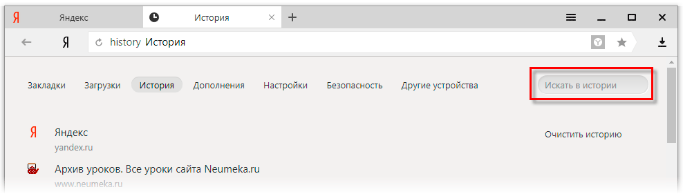 Искать в Истории можно не только по названию статьи, но и по адресу сайта. Для этого наберите часть адреса, и программа покажет все подходящие варианты.