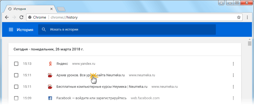 В Истории показаны все сайты, которые открывали в Google Chrome за последнее время. Список отсортирован по дням, часам и минутам. Чтобы перейти на страницу, просто щелкните по ней мышкой.