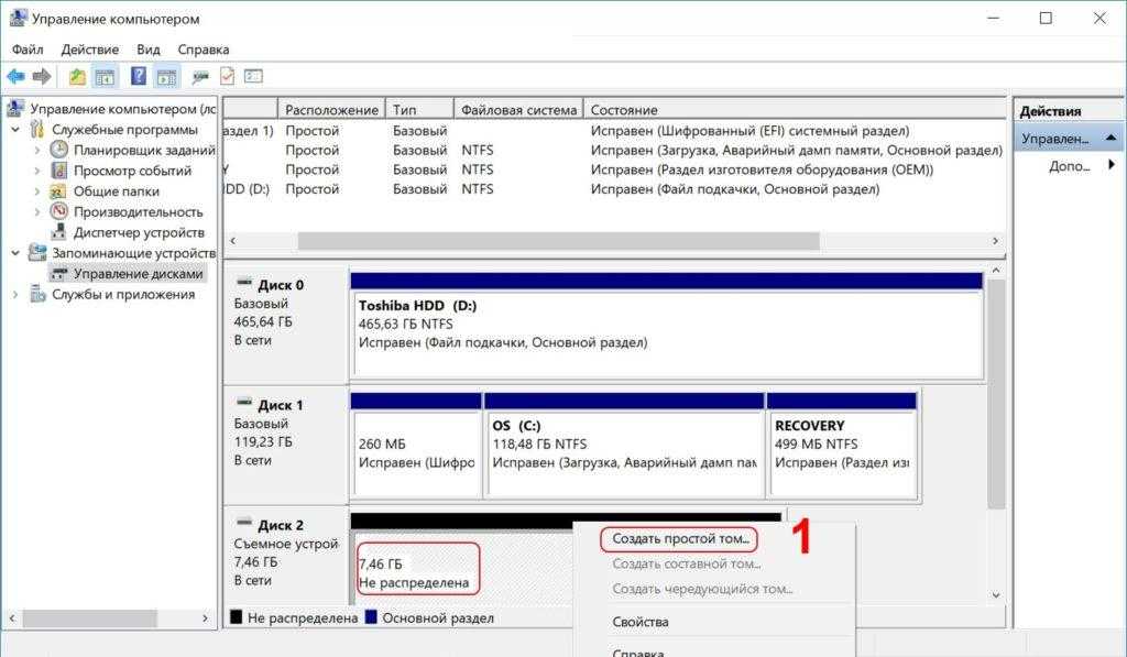 Кликаем правой кнопкой мыши по вкладке с неисправным жестким диском и выбираем «Создать простой том».