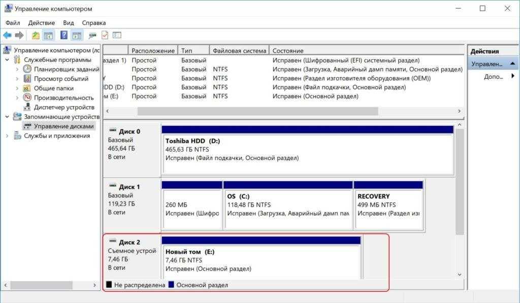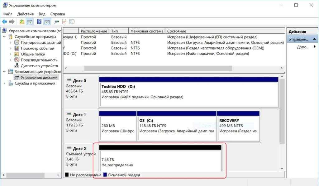 Если жесткий диск работает, то одним из атрибутов будет надпись «Исправен». В противном случае на вкладке с диском вы увидите надпись «Не распределена». Именно это и является основной причиной отображения винчестера в системе Windows 10.