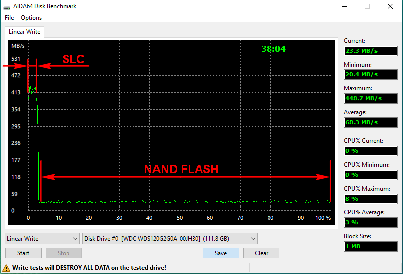 В результате более медленная память MLC или TLC может записывать данные практически со скоростью более быстрой и дорогой SLC. Именно эта скорость обычно и фигурирует в заявленной производителем максимальной линейной скорости записи.