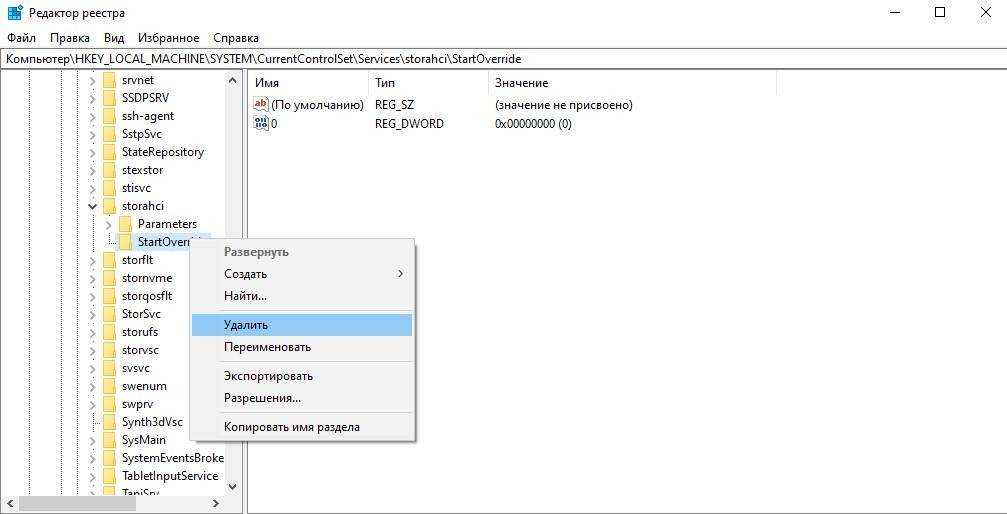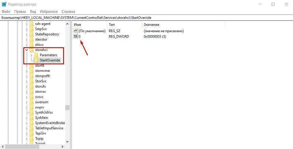 Далее в этом же разделе «storahci» нужно выбрать подраздел «StartOverride».