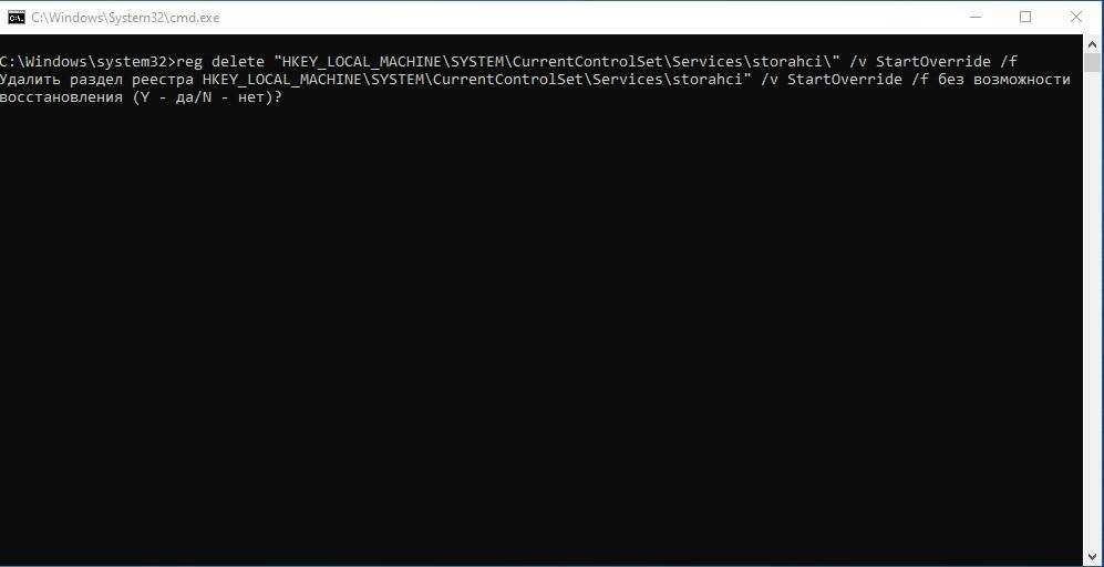 reg delete»HKEY_LOCAL_MACHINE\SYSTEM\CurrentControlSet\Services\storahci\» /v StartOverride /f