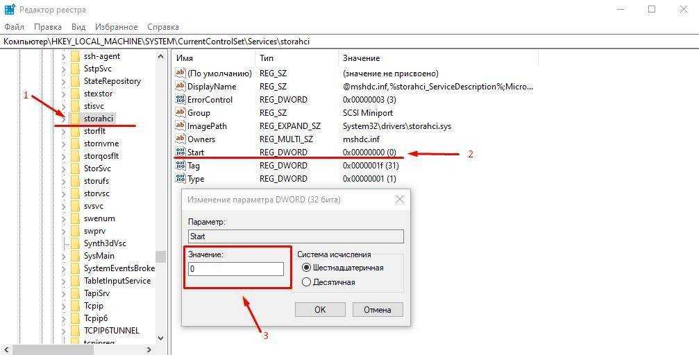 Теперь листаем вниз, ищем раздел «storahci». Нажимаем на него, и выбираем параметр «Start». В строке «Значение» также ставим ноль.