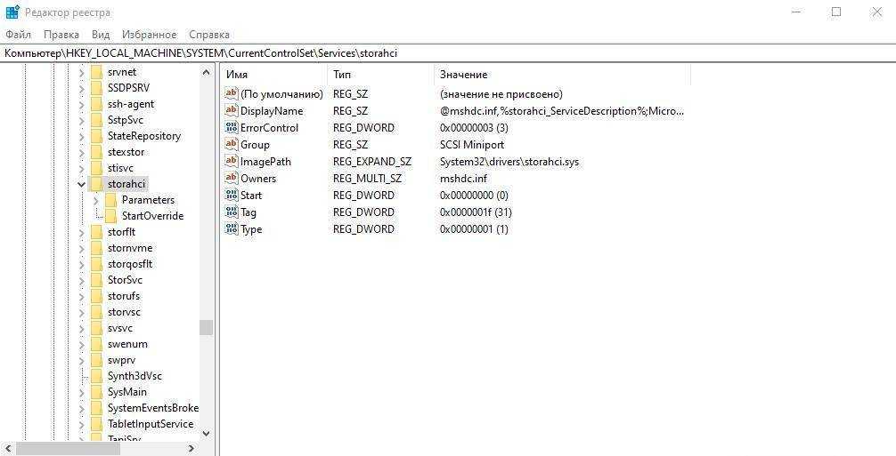 - в том же разделе реестра («Services») найти папку под названием «storahci»;