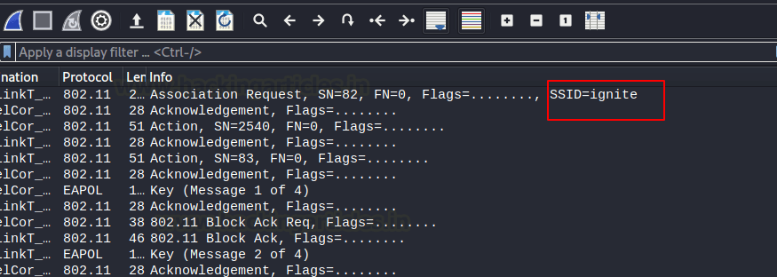 Следующий олдскульный способ — обнаружение скрытого SSID с помощью Wireshark. Когда клиент подключается к точке доступа, вместе с пакетом аутентификации передается скрытый SSID.