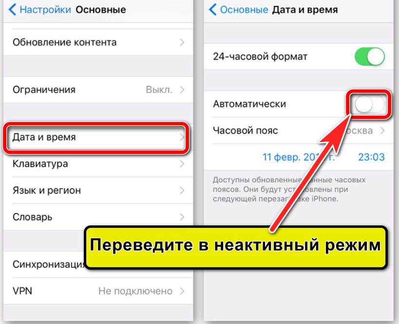 Для операционной системы iOS также вы можете установить время вручную или установить автоматическое считывание времени из Интернета.