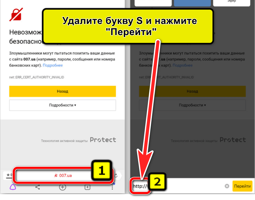 Как и при работе с компьютером, если вы уверены в надёжности сайта, выбираем принудительный переход на страницу. Для этого проделываем уже описанный выше механизм. В телефоне он ничем не отличается от процесса на компьютере.