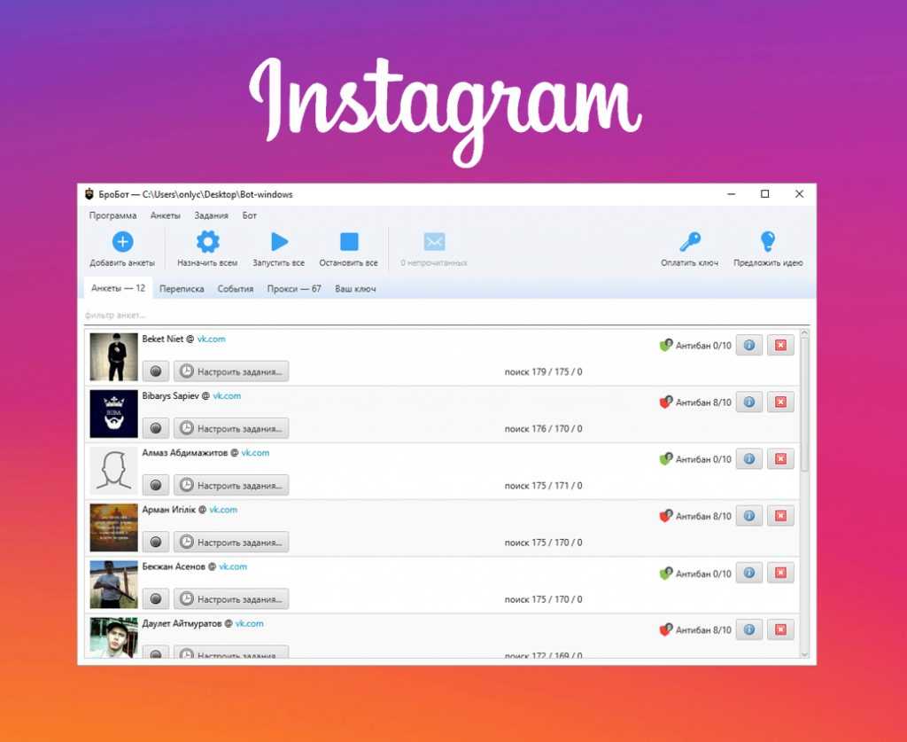 Программы для накрутки ботов в Инстаграмм помогут организовать существенную прибавку к скорости продвижения Вашего профиля в сети. Такой софт, в основном, бесплатный, с возможностью подключить платную, расширенную версию. Эти приложения можно разделить на две разновидности: одни работают по принципу обменников, другие автоматизируют манипуляции в соцсетях. Установите такую программу на ПК или мобильное устройство, и наслаждайтесь автоматизированным массфолловингом, лайкингом, и прочими прелестями. Самыми популярными в этой среде считаются приложения BroBot и Vto.pe.