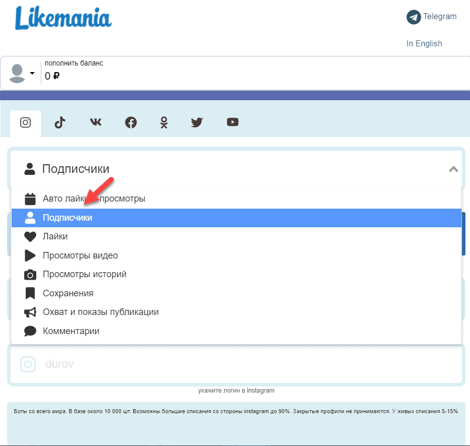 Весь процесс займет не более 5 минут. Возьмем для примера сервис Likemania: он дешев, надежен и безопасен. Перейдите на сайт онлайн-инструмента. В списке услуг выберите «Подписаться».