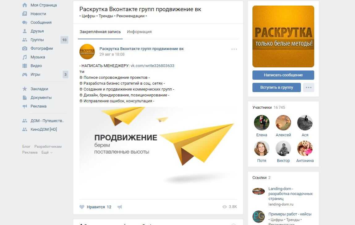 в ВК, вбив в поиск «продвижение социальных сетей».