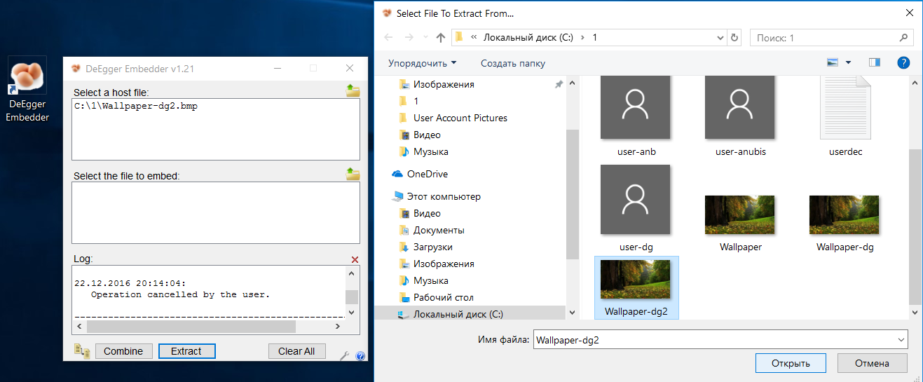 DeEgger Embedder — еще одна маленькая программа для стеганографии. В ней реализован уже больший набор функций, но его использование требует установки .NET Framework 3.5. Помимо редко используемых сегодня картинок BMP, программа поддерживает в качестве контейнеров PNG, JPG, видеофайлы AVI и музыкальные MP3. Утилита ведет подробный лог своих действий, который отображается прямо в главном окне.