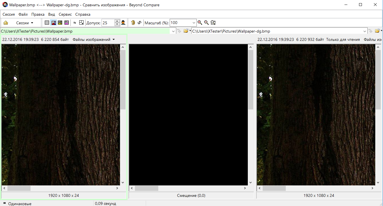 После обработки в DeEgger утилиты для сравнения изображений считают идентичными исходный и конечный файлы BMP. Реально же это пустой и заполненный контейнер в терминологии стеганографии.
