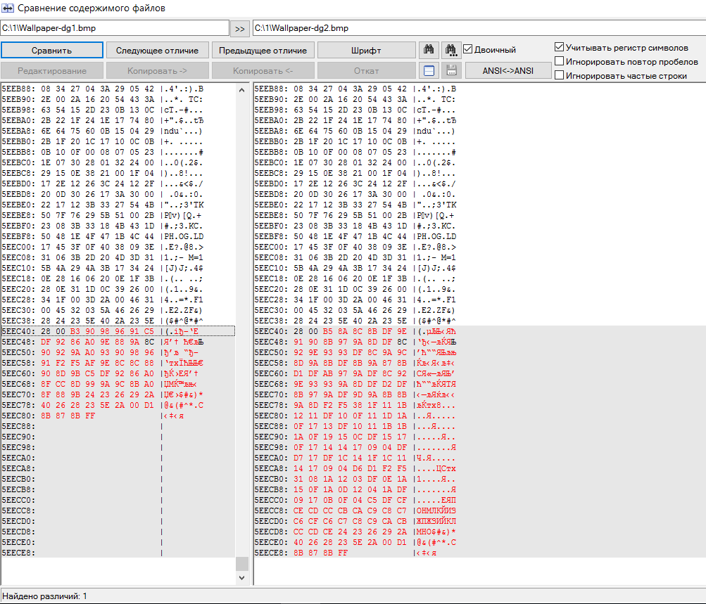 Вот одинаковый участок в шестнадцатеричном виде: .