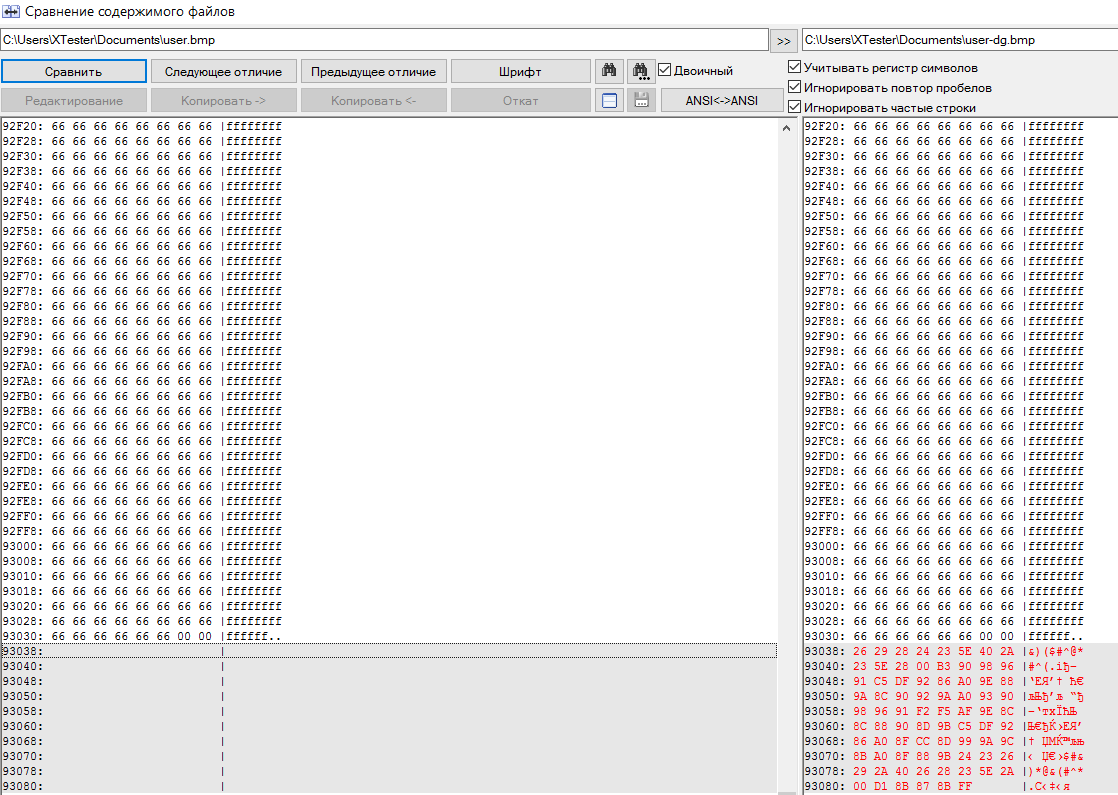 Сделаем побайтное сравнение. Знакомая картина? Так же как и Anubis, утилита DeEgger Embedder дописала стегосообщение в конец файла-контейнера. В картинке user.bmp много однотонных областей, поэтому такой аппендикс выглядит особенно заметно.