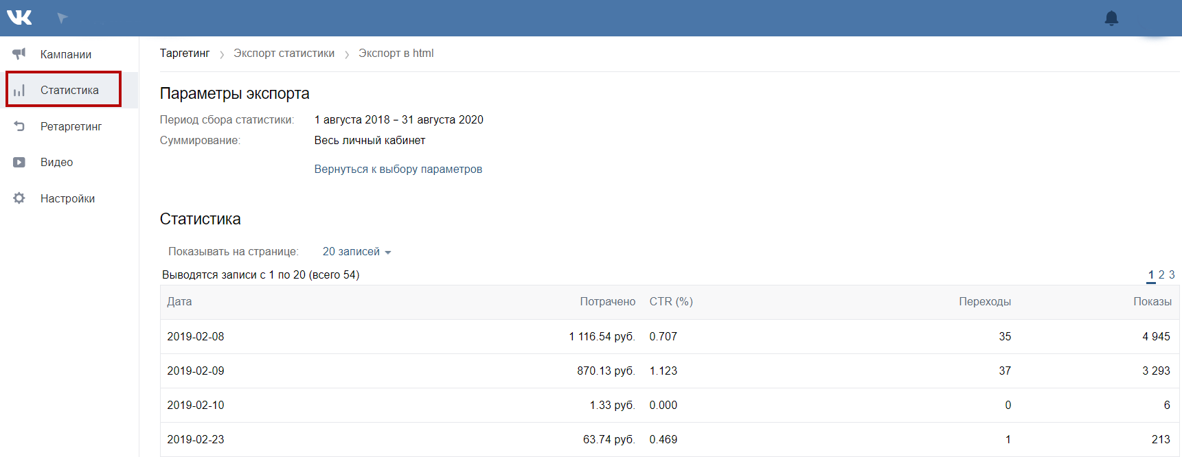 Вы можете разбить сведения по кампаниям или записям, выбрать формат вывода: html, xls или csv, задать период отчетности и скачать файл.