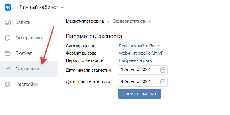 В рекламном кабинете маркет-платформы вы можете выгрузить статистику, чтобы проанализировать эффективность рекламных постов. Данные доступны в разделе «Статистика».