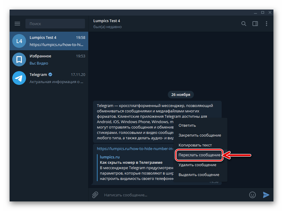Кроме прочего, вы можете использовать рассматриваемое личное хранилище в качестве получателя пересылаемых из других чатов посланий: