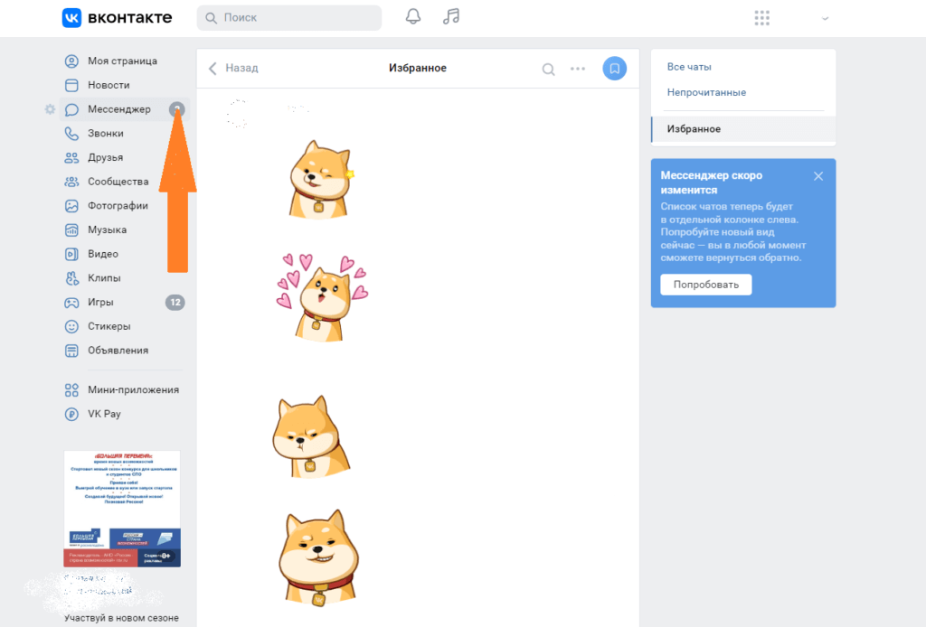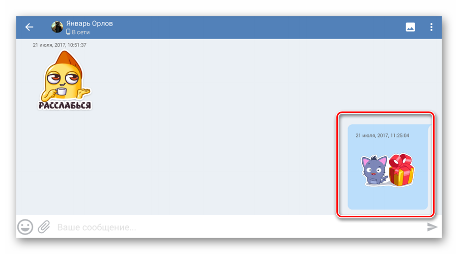 - Возвратитесь к диалогам VK и сделайте перезагрузку странички. Теперь нужно интерфейс со стикерами открыть заново.