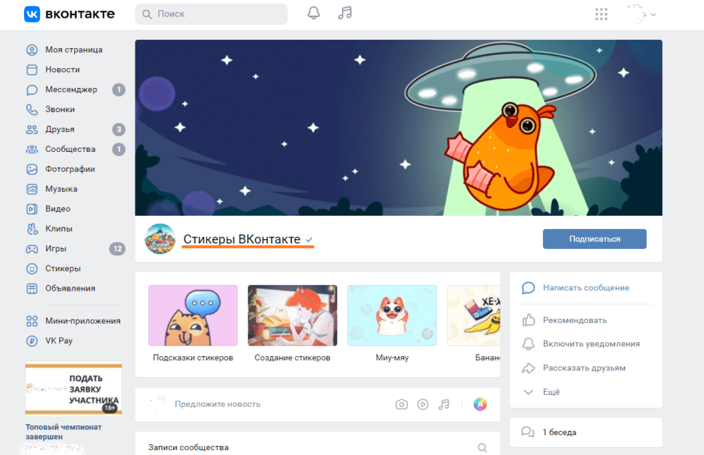 В поиске сообществ наберите «Стикеры ВКонтакте» и перейдите на первый паблик.