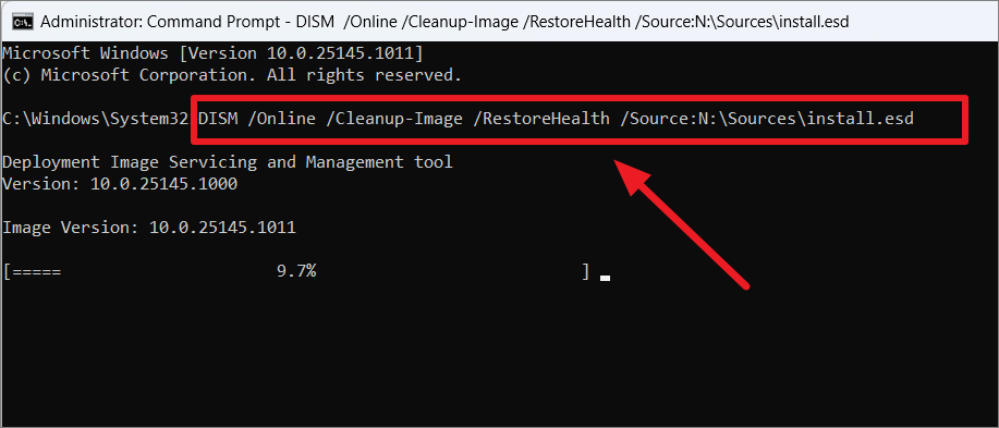 Если у вас нет доступа к Интернету или DISM обнаруживает проблемы с заменой поврежденных файлов, вам потребуется предоставить другой образ Windows с помощью загрузочного установочного носителя или ISO-файл Windows 11. Вы можете использовать файл install.wim или install.esd с загрузочного установочного носителя или смонтированный ISO-файл Windows 11 для запуска DISM в автономном режиме.