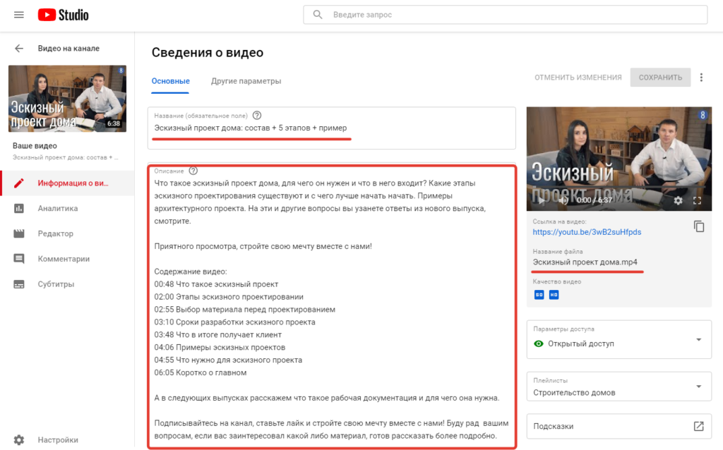 Один или два раза упомяните в тексте заголовок, который вы написали в название ролика.