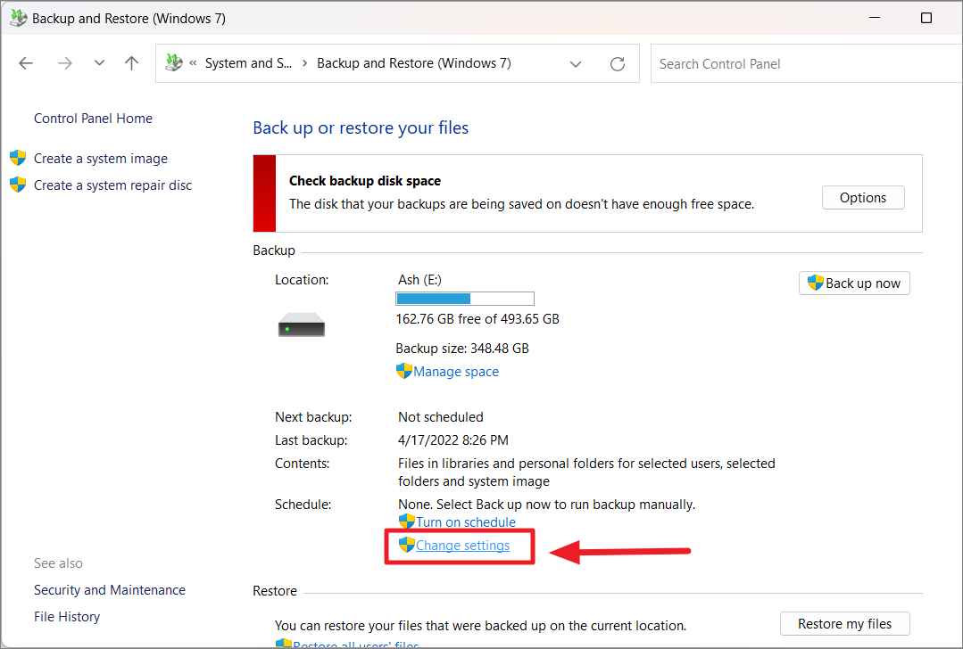 Однако, если вы уже настроили диск резервного копирования на своем компьютере, этот параметр «Настроить резервное копирование» не появится. В этом случае нажмите «Изменить настройки» в разделе «Резервное копирование».