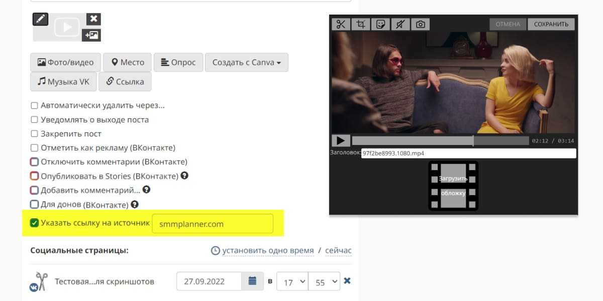 Также допускается, что из чужих видео будут делать новые ролики или использовать их с указанием авторства. С последним поможет сервис автопостинга SMMplanner – при публикации поста можно сразу указать ссылку на первоисточник.
