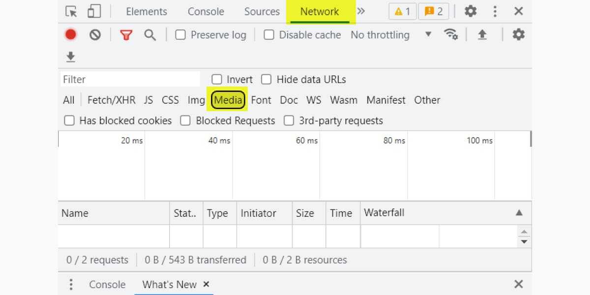 В инструментах разработчика перейдите в закладку Network — закладка Media.