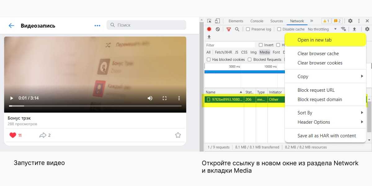 Шаг 4. Найдите ссылку на видео через инспектора. Запустите проигрывание видео в сообщении, посте, сторис или клипе. В разделе Name появится ссылка на запущенное видео – кликните по ней правой кнопкой и откройте в новой вкладке.