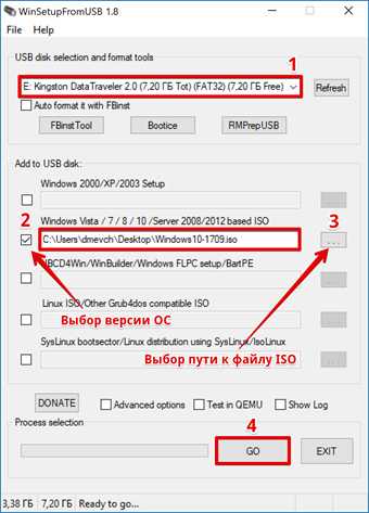 Название этой программы говорит само за себя. Основное ее назначение ‒ создание загрузочной флешки, предназначенной для установки Windows. С официального сайта WinSetup загружается в виде самораспаковывающегося архива. Внутри содержатся служебные файлы и две версии программы: для 32- и 64-битных систем. Запускаем подходящую по разрядности для текущей ОС. В области, отмеченной цифрой «1», автоматически определится подключенная флешка. Выбираем нужную версию ОС, указываем путь к файлу образа и запускаем процесс записи.