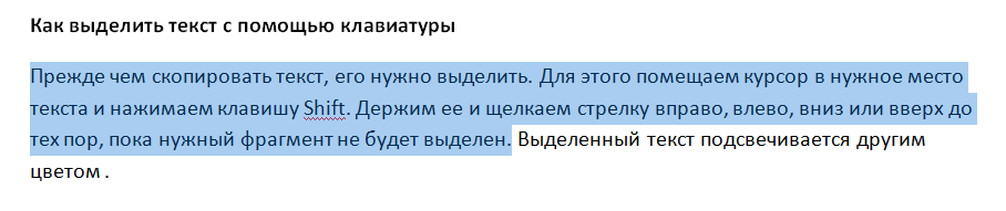 Shift+стрелка. Прежде чем скопировать текст, его нужно выделить. Для этого помещаем курсор в нужное место текста и нажимаем клавишу Shift. Держим ее и щелкаем стрелку вправо влево, вниз или вверх до тех пор, пока нужный фрагмент не будет выделен. Выделенный текст подсвечивается другим цветом: