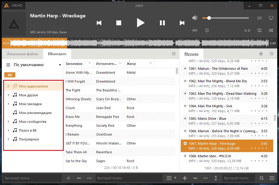В AIMP вы получите доступ не только к своим аудиозаписям, но и к спискам: