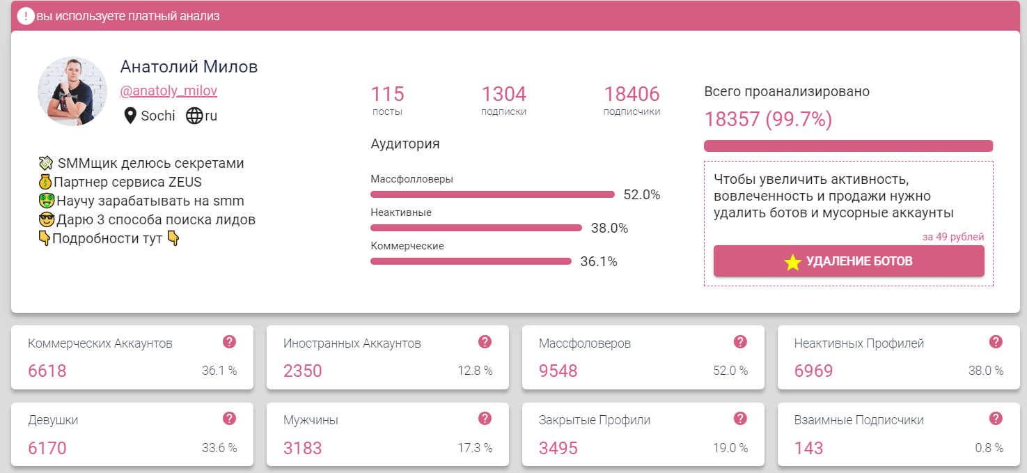 Кроме того, с помощью сервиса можно увеличить ER, почистив подписчиков от ботов и фейков. Попробовать