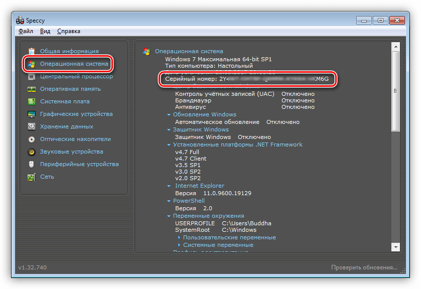 Узнаём ключ продукта Windows 10 при помощи «Speccy»