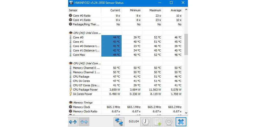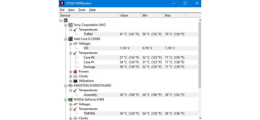 Отличное бесплатное ПО для проверки статуса аппаратных элементов ПК. Для просмотра температурных данных процессора достаточно установить утилиту, запустить, зайти во вкладку «Temperatures», расположенную в основном меню программы, – раздел «Sensor». Сведения о степени нагрева CPU отображаются в градусах Цельсия – параметр «Package». Можно узнать минимальную и максимальную степень нагрева ПК или ноутбука в столбцах «Min» и «Max», а также узнать текущее состояние в колонке «Value».