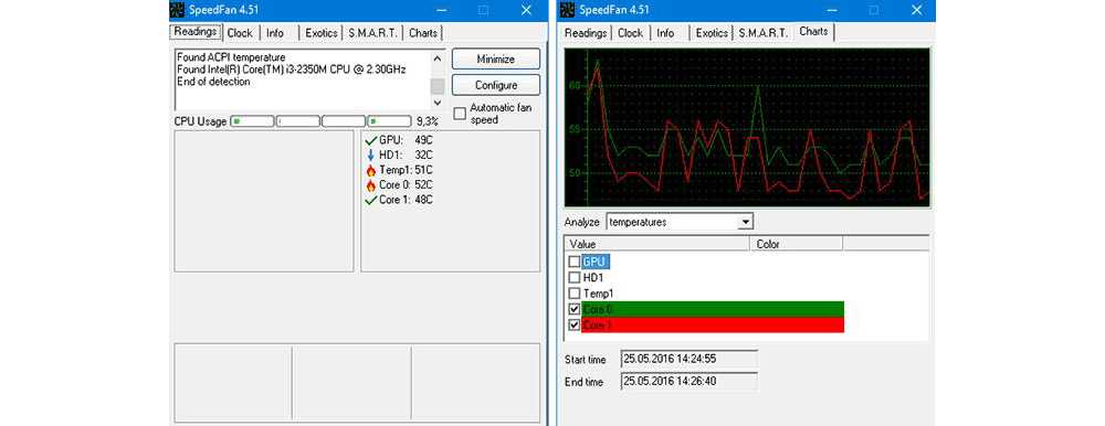 После установки программы перейти во вкладку «Readings» из основного меню и отследить скорость вращения вентиляторов охлаждения ПК. Также в Speed Fan можно узнать степень перегрева всех ключевых компонентов системы. Фишкой программы является наличие графиков, а также возможность ускорения скорости вентилятора для снижения нагрева CPU.