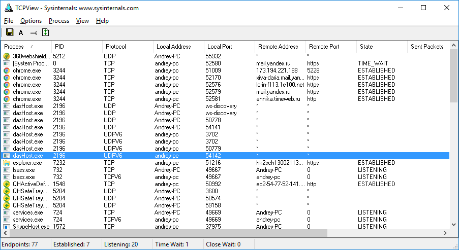 Итак, утилита TCPView занимается мониторингом сетей и показывает в виде списка все подключенные к сети программы, порты, адреса и соединения.