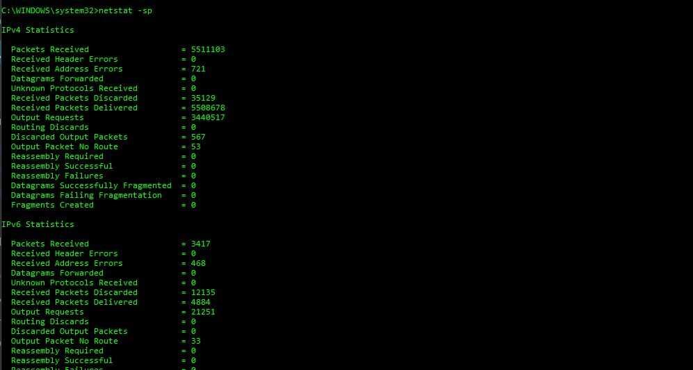 -s = -s опция может использоваться с командой netstat для отображения подробной статистики по протоколу. Вы можете ограничить статистику, показанную на конкретном протоколе, используя -s и указать, что протокол , но обязательно используйте -s до -п протокол при использовании переключателей вместе.