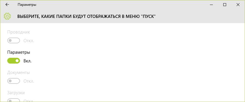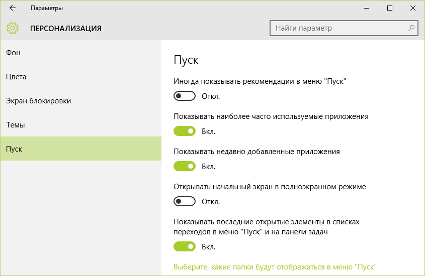 В разделе «Пуск» находятся ползунки-переключатели: