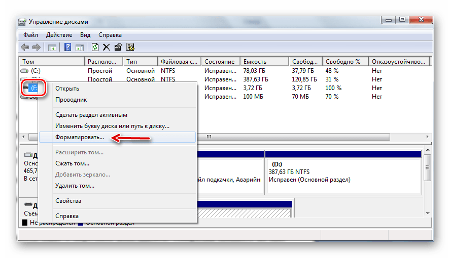 Данный инструмент, в отличие от обычного форматирования в разделе «Компьютер», имеет больший приоритет в системе, поэтому операцию сделать лучше с помощью него.