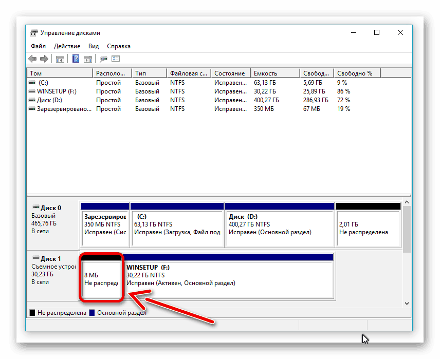 Раздел может быть ещё отмечен как «Не распределен» обычно это означает, что повреждена файловая система. Попробуйте выполнить правый клик мыши и, если таковой пункт обнаружится в меню, выберите «Создать простой том» для создания раздела и форматирования флешки (данные, к сожалению, при этом будут удалены).