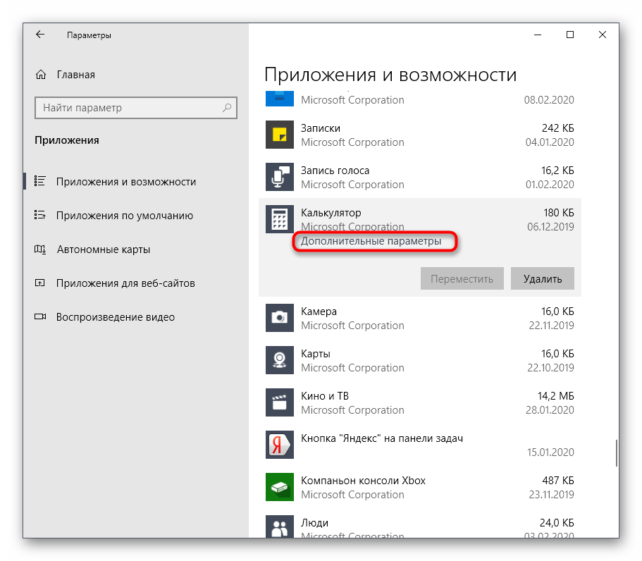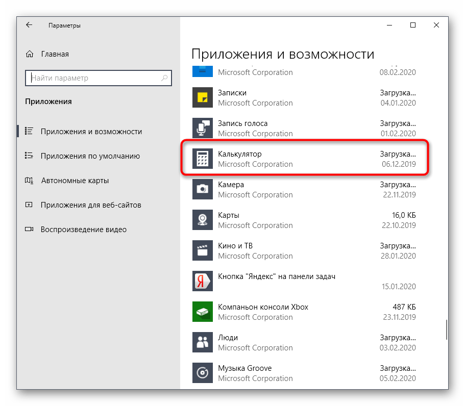 Откроем вкладку «Приложения и возможности». В списке приложений найдём «Калькулятор» и выделим его щелчком мыши.