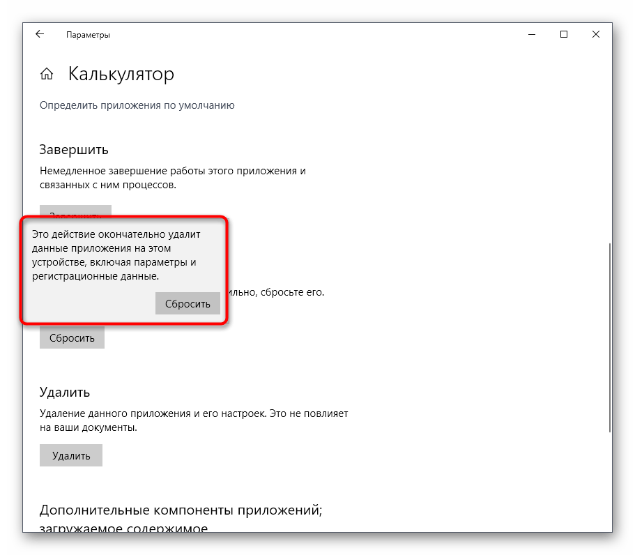Сначала нажмите по «Завершить», чтобы закончить все процессы, связанные с Калькулятором, а затем на «Сбросить» для обнуления настроек.
