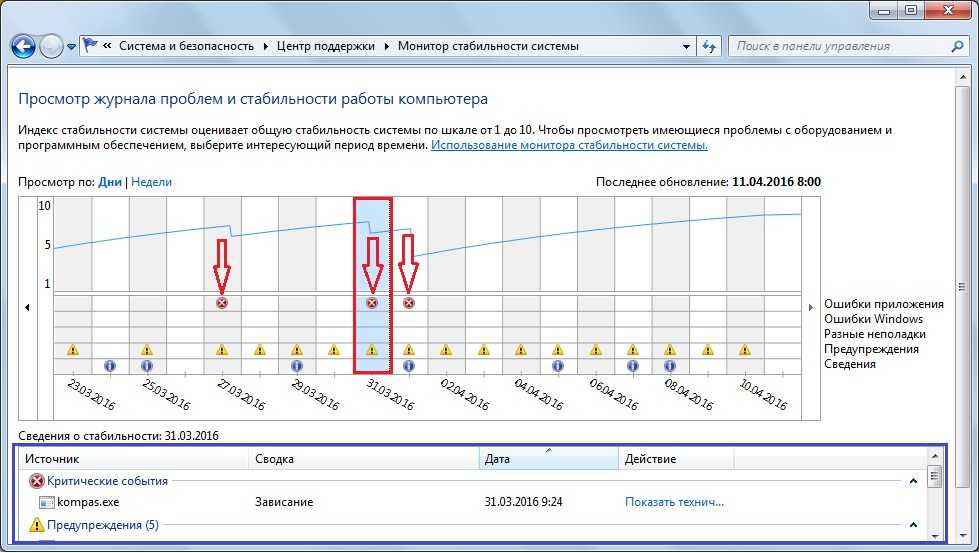 Для этого нужно просто нажать на этот столбец. Открывается меню, выделенное синей рамкой. Там среди критических событий можем видеть, что программа kompas.exe зависала.