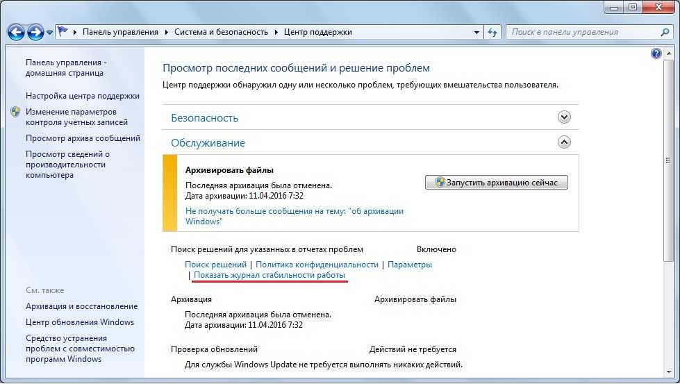 Возможной причиной «не выключения» компьютера могут стать программы или службы, например, какая то служба не завершила свою работу и зависла, что привело к неполадкам при отключении. Чтобы обнаружить проблему, нам необходимо зайти в Монитор стабильности системы. Для этого переходим в панель управления, переключаемся из вида «категории» в вид «значки» и ищем центр поддержки. Там же открываем раздел Обслуживание и переходим в пункт: показать журнал стабильности системы.