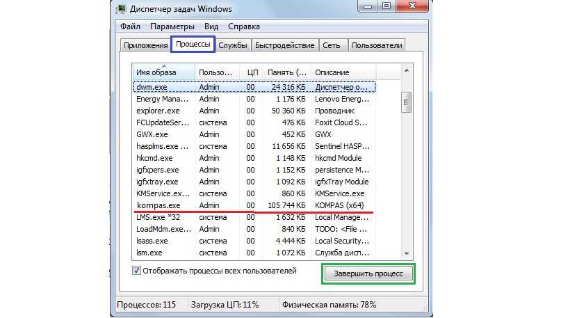 Важно: Проблемы могут возникать не только с процессом kompas.exe. Он приведен лишь в качестве примера