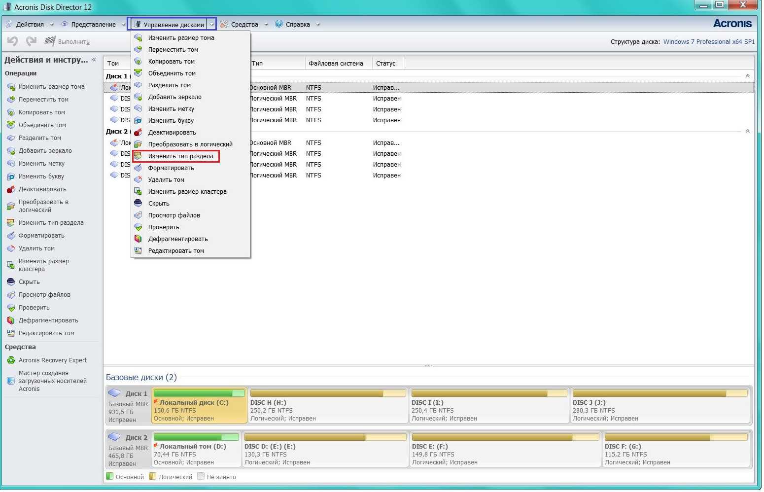 В данном случае необходимо нажать на кнопку «Изменить тип раздела» (выделен красной рамкой).